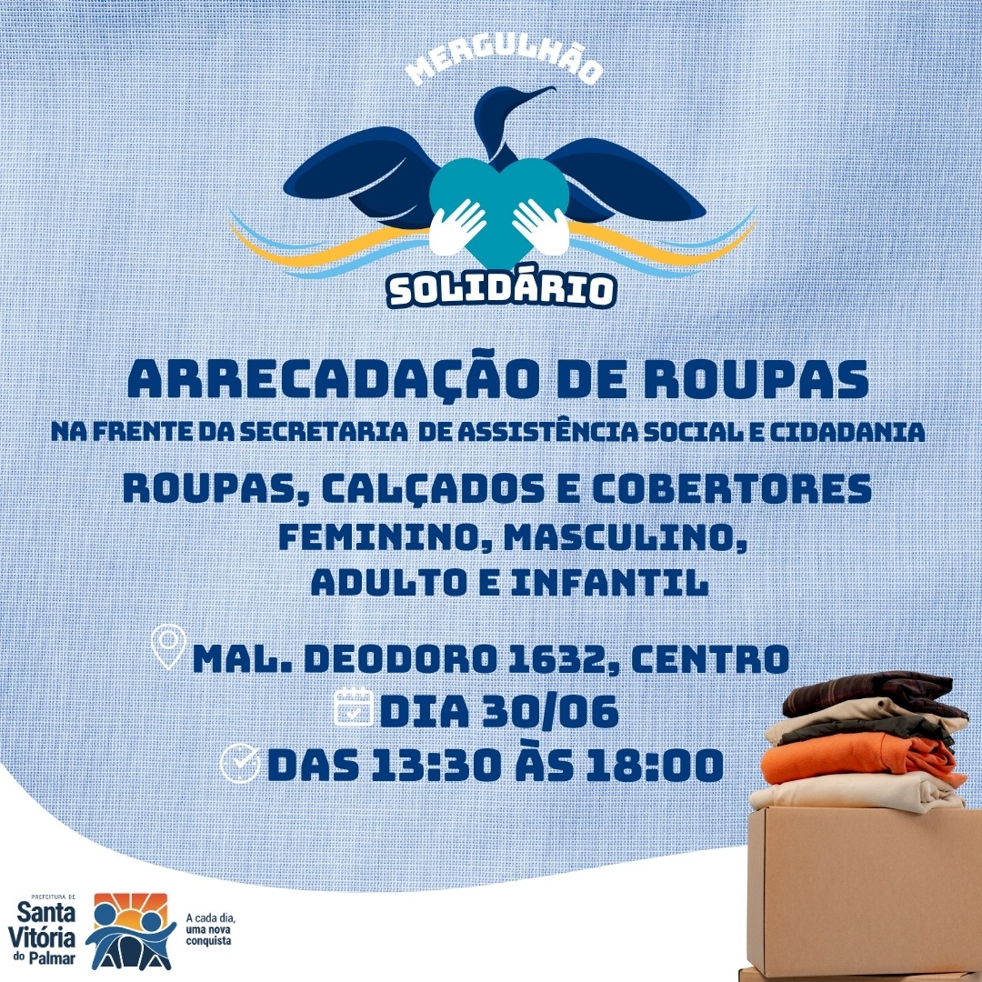Na próxima segunda-feira, 30 de junho, a Prefeitura de Santa Vitória do Palmar dará início a mais uma edição da campanha Mergulhão Solidário, com o objetivo de arrecadar roupas de inverno, calçados e cobertores para atender pessoas em situação de vulnerabilidade durante o rigoroso inverno da região.